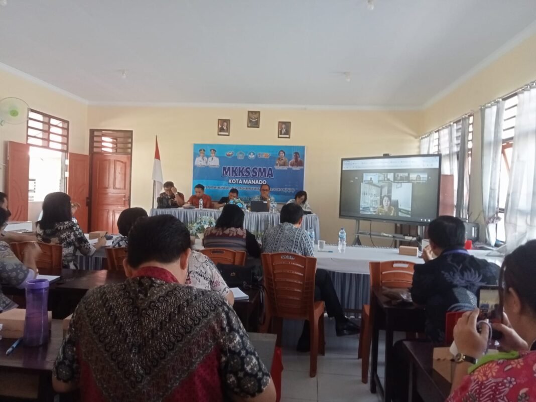 Musyawarah Kerja Kepala Sekolah (MKKS) SMA Kota Manado mengikuti zoom meeting persiapan peringatan Hari Pendidikan Nasional (Hardiknas) 2026 bersama Dinas Pendidikan Daerah Provinsi Sulawesi Utara.Kamis (16/4/2026) di SMAS Pertiwi,SMA Tridarma Kota Manado.